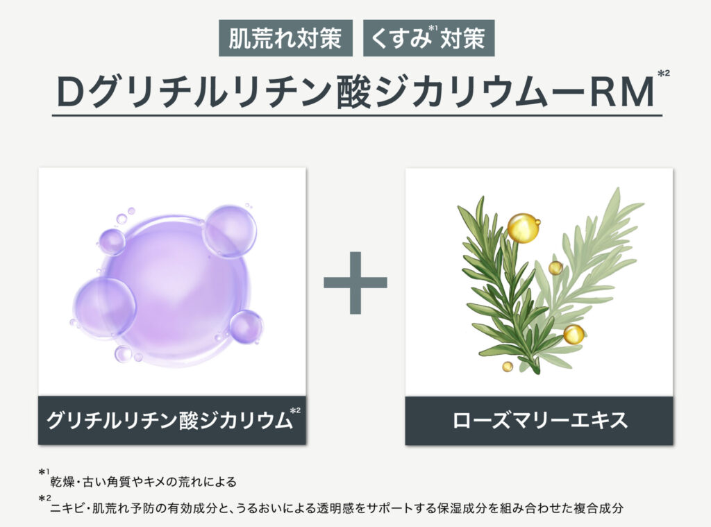 また、肌荒れ・くすみ※1対策として独自成分である「Dグリチルリチン酸ジカリウムRM※2」を配合。有効成分であるグリチルリチン酸ジカリウムは「大人ニキビ※3」や「肌荒れ」の予防ケアに効果があり、RM(ローズマリーエキス)は透明感をサポートする成分です。