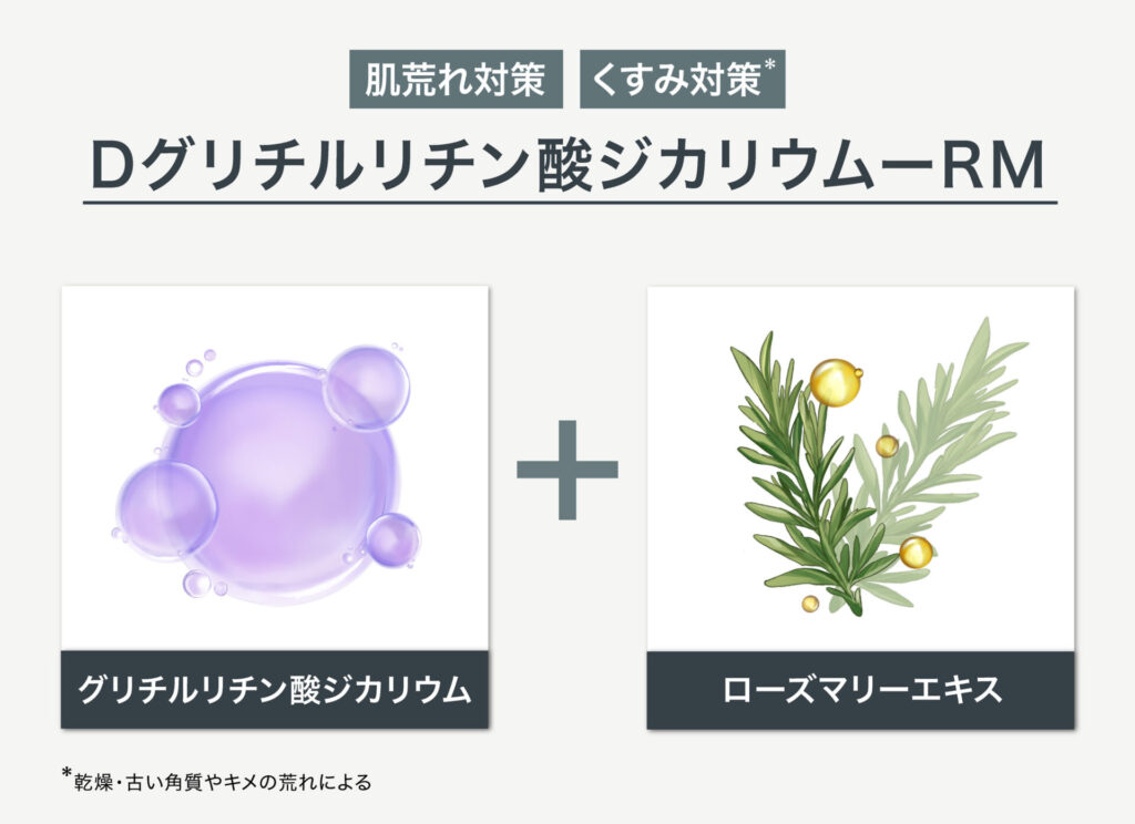 また、肌荒れ・くすみ※対策として独自成分である「Dグリチルリチン酸ジカリウムRM」を配合。有効成分であるグリチルリチン酸ジカリウムは「大人ニキビ※」や「肌荒れ」の予防ケアに効果があり、RM(ローズマリーエキス)は透明感をサポートする成分です。