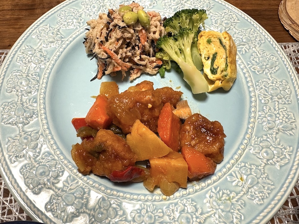 届いたその日に食べた主菜が「つくりおき.jp流!酢豚」。副菜の「ひじきと切り干し大根のサラダ」を添えて、妻が夕食として食卓に出してくれました。
