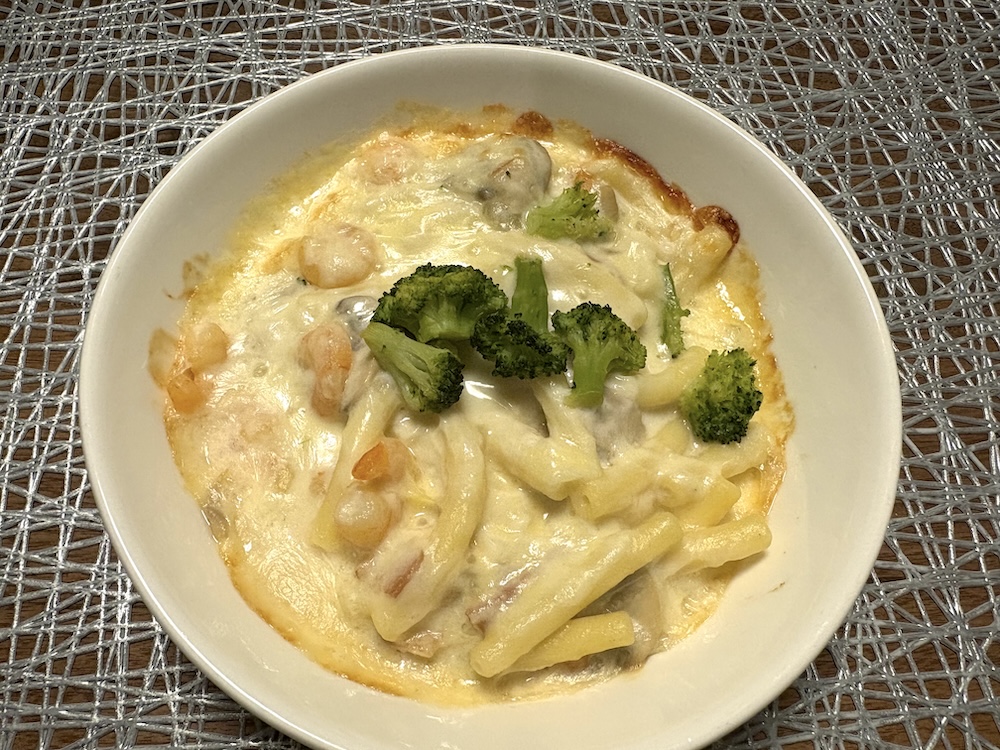 主菜の「マカロニえびグラタン」は下の画像の状態のため、お皿に取り分けた後にオーブンで焼いていただきました。