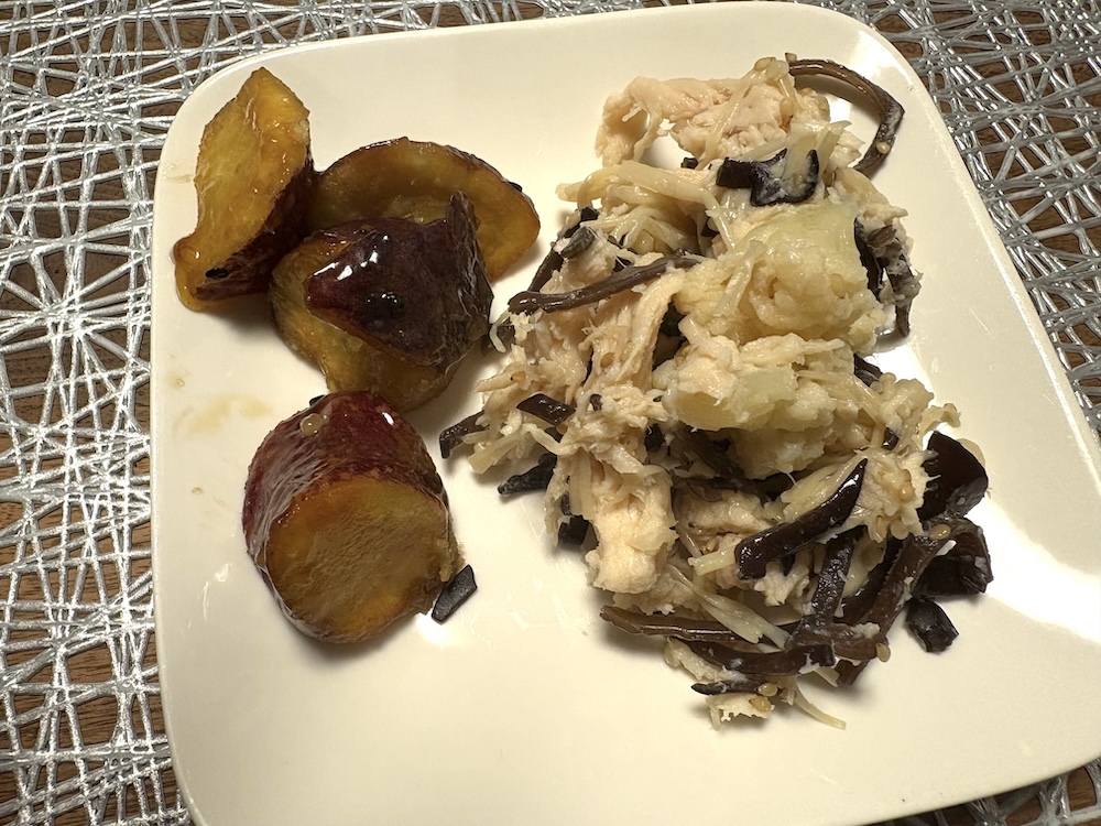 主菜は「マカロニえびグラタン」。副菜の「タンパク質が摂れる蒸し鶏のナムル」、「黒蜜たれの大学芋」を別皿に取り分けて、夕食に妻が食卓に出してくれました。