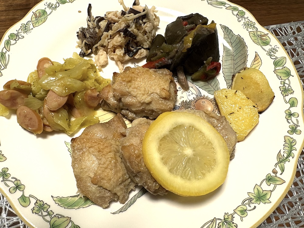 主菜は「タイ風グリルチキン」、副菜は「なすとツナの揚げ浸し」、「キャベツとソーセージのカレー炒め」、1日目と2日目で残った副菜を添えて、この日の夕食としていただきました。